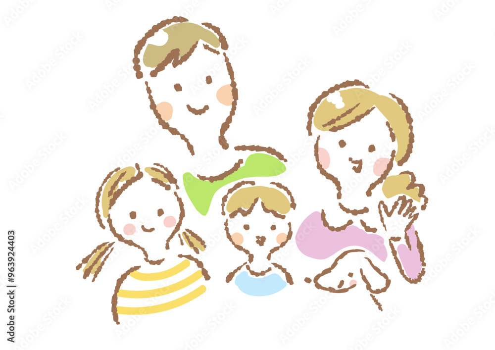 Fotografie 笑顔の4人家族と愛犬の上半身手描きイラスト