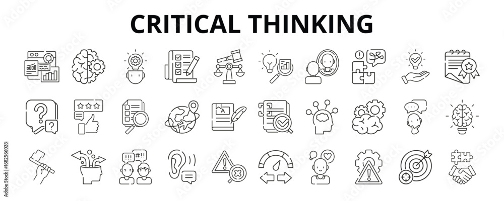 Fotografie 30 Critical Thinking Line Icons Vector - Logic, Evaluation, Insight, Solution, A