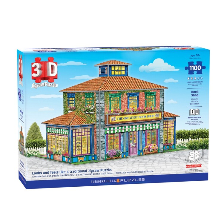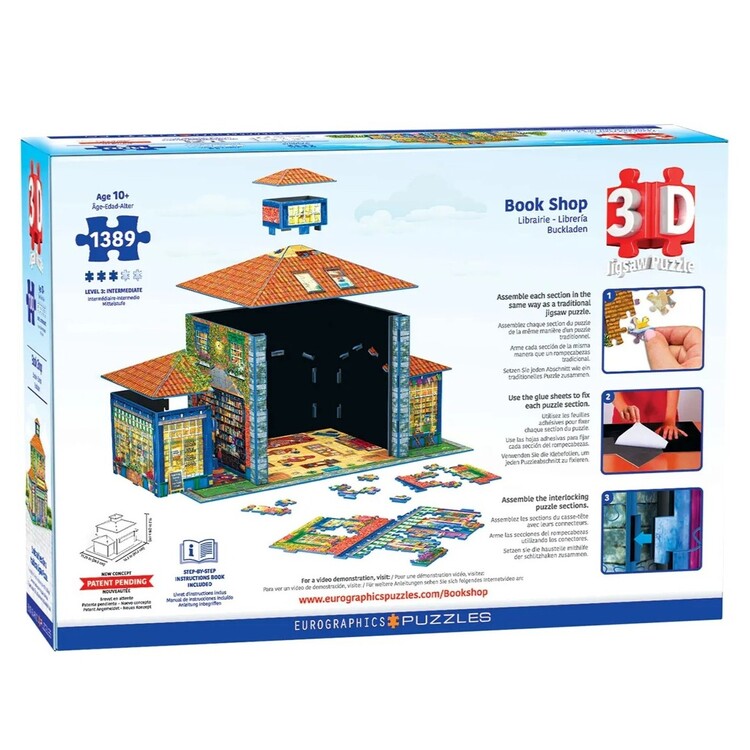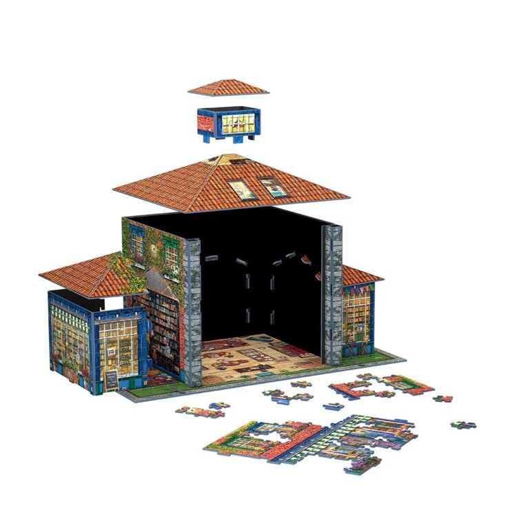 Vůně stránek a klid mezi regály v mini podobě. 3D model dvoupatrového knihkupectví (1389 dílků) se skládá z 8 samostatných sekcí, každá zabalená zvlášť pro postupné skládání jako u klasického puzzle. Přesně vyřezané dílky se snadno spojují; hotové sekce se zafixují přiloženými samolepicími archy a podpěrnými výztuhami a propojí do pevné 3D stavby. Součástí je podrobný návod krok za krokem. Ideální kousek pro milovníky knih i puzzle.