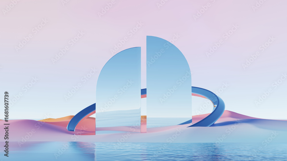 Fotografie 3d render, surreal abstract scene with mirrored arch shapes and ring
