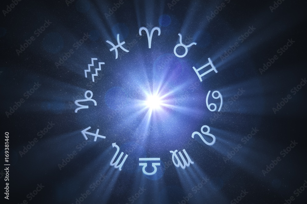 Fototapeta 3D rendered illustration of glowing astrology zodiac signs on starry dark background