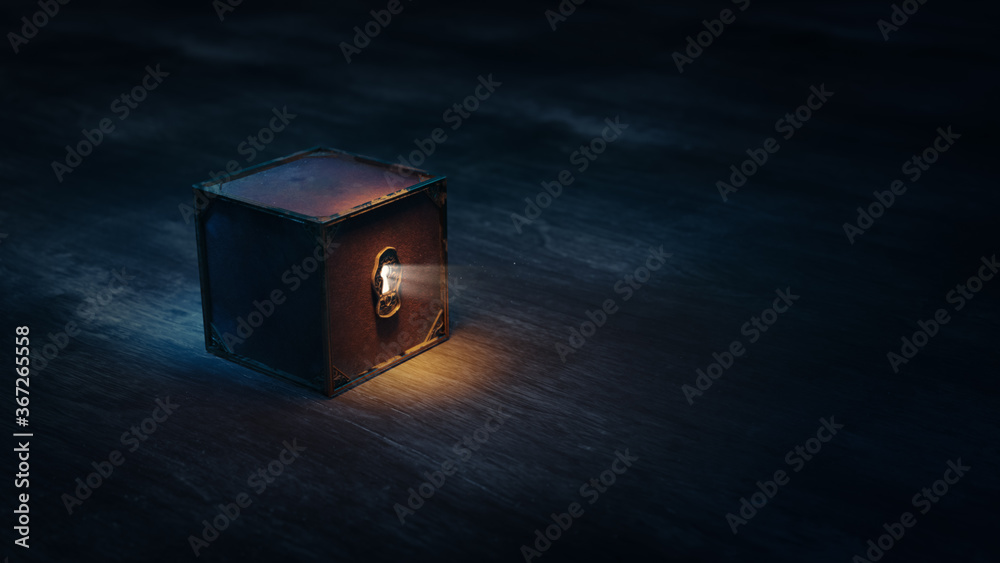 Obraz na plátně (3D Rendering, Illustration) Mysterious locked box with light coming through its