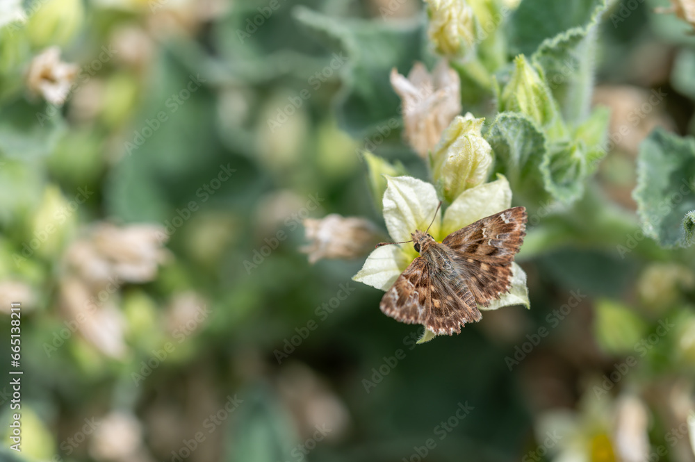 Fotografie A butterfly on yellow flowers of a Gherkin of the devil (Ecballium elaterium)