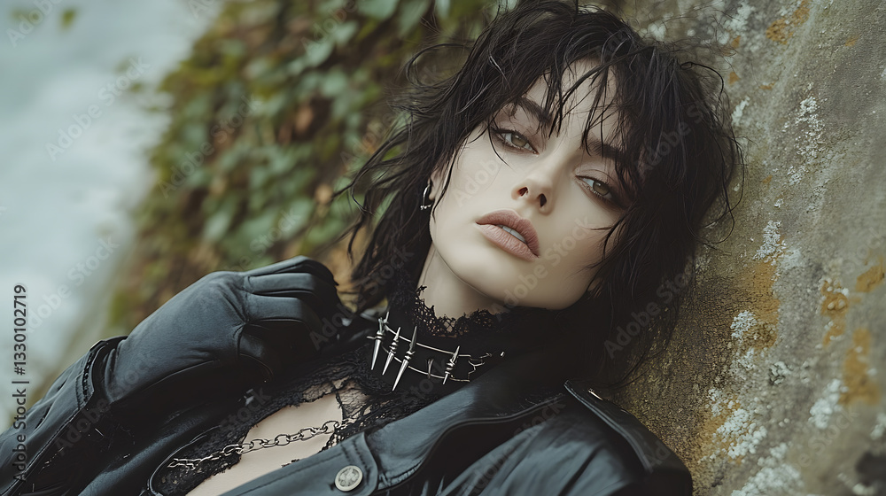 Fotografie A captivating photography of a gothic model adorned in an oversized leather coat, lace gloves, and a spiked collar necklace, leaning against a crumbling stone wall with ivy creeping over it