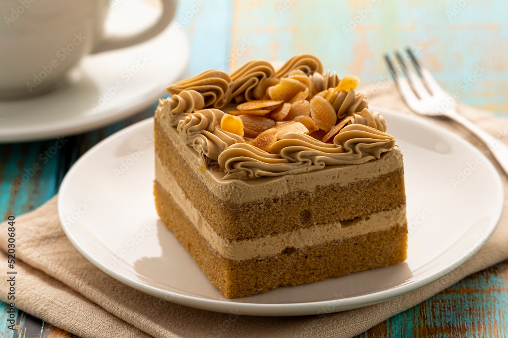 Obraz na plátně A caramel mocha mini cake topped with almonds served on a white plate together with a cup of coffee as background for a coffee break time