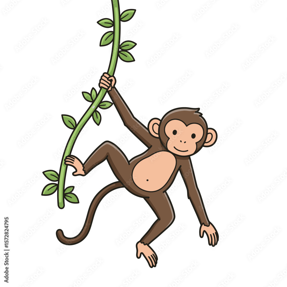 Fotografie A cartoon monkey hangs from a green vine with leaves