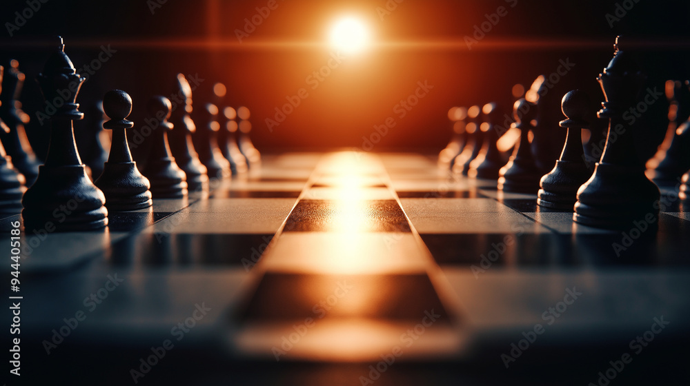 Fotografie A chessboard with pieces that resemble warriors in armor, on a plain dark background, symbolizing the battle of wits and strategy in competitive business environments