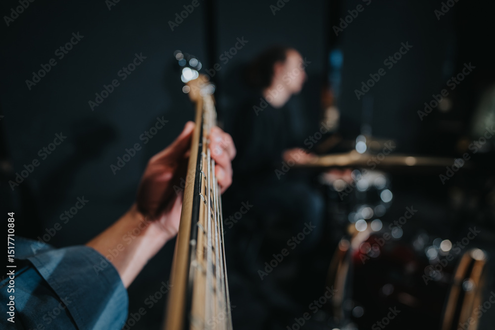 Fotografie A detailed shot focusing on a guitarist's hand on the fretboard, with a drummer performing in the background, suggesting a lively band practice or music studio environment