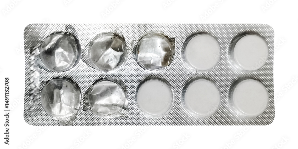 Fotografie A direct overhead shot of a blister pack, prominently displaying four white, round pills on one side and six empty, pressed-out compartments on the other