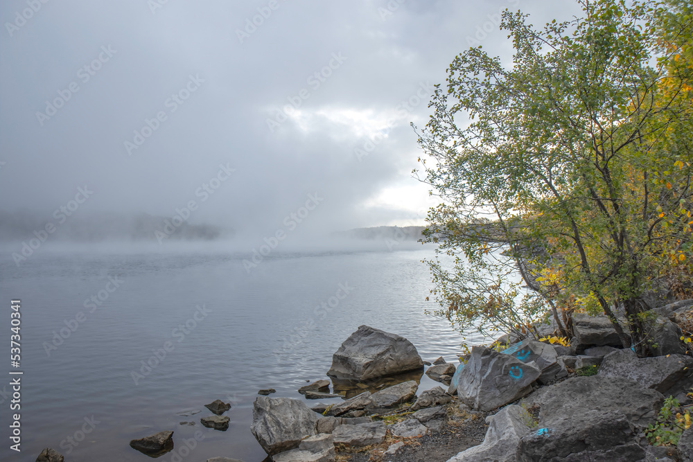 Fotografie A fog bank drifting across a river, trees and large boulders in foreground, dayt