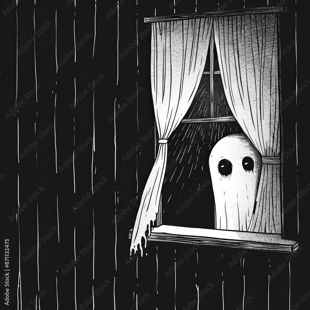 Fotografie A ghost or apparition in a white sheet peeks in the window at night