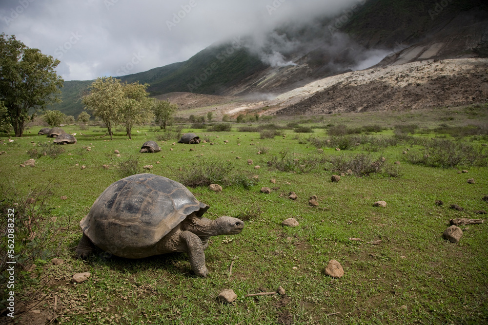 Fotografie A giant tortoise walks along the floor of Alcedo Volcano in the Galapagos