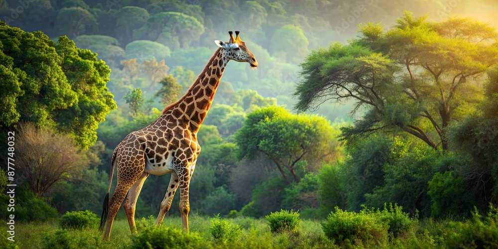 Fotografie A giraffe gracefully roaming through the lush forest, giraffe, wildlife, nature,