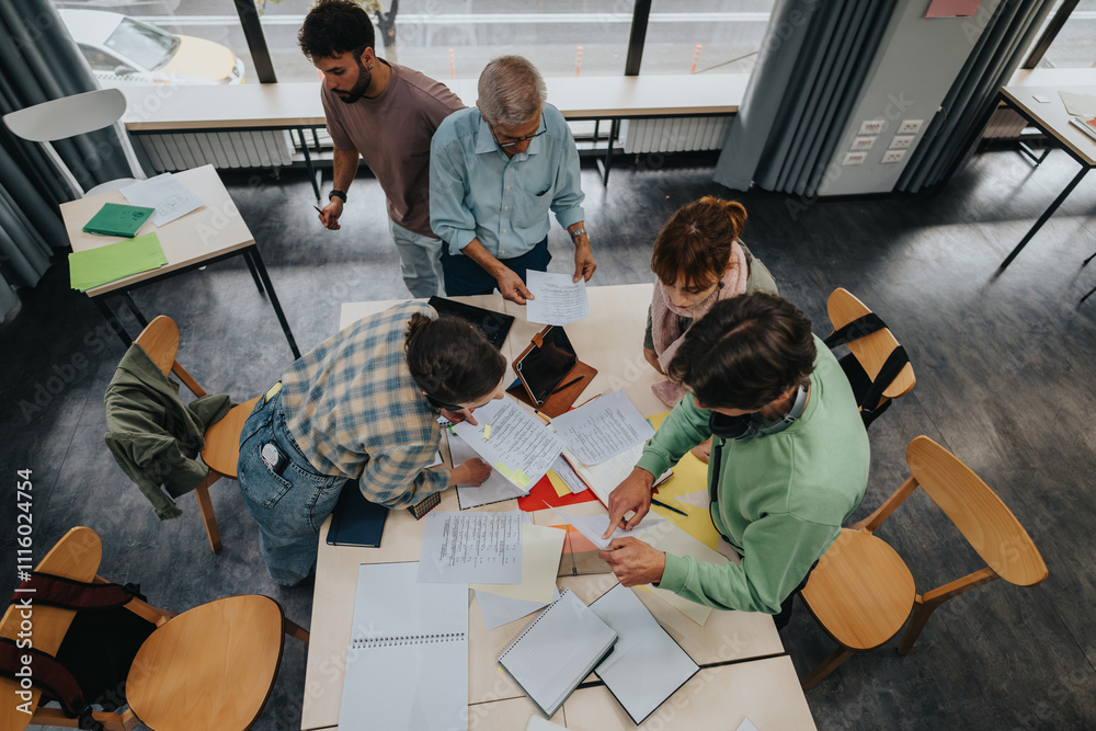 Fotografie A group of college students work together on a project under the guidance of an elderly professor in a contemporary classroom setting