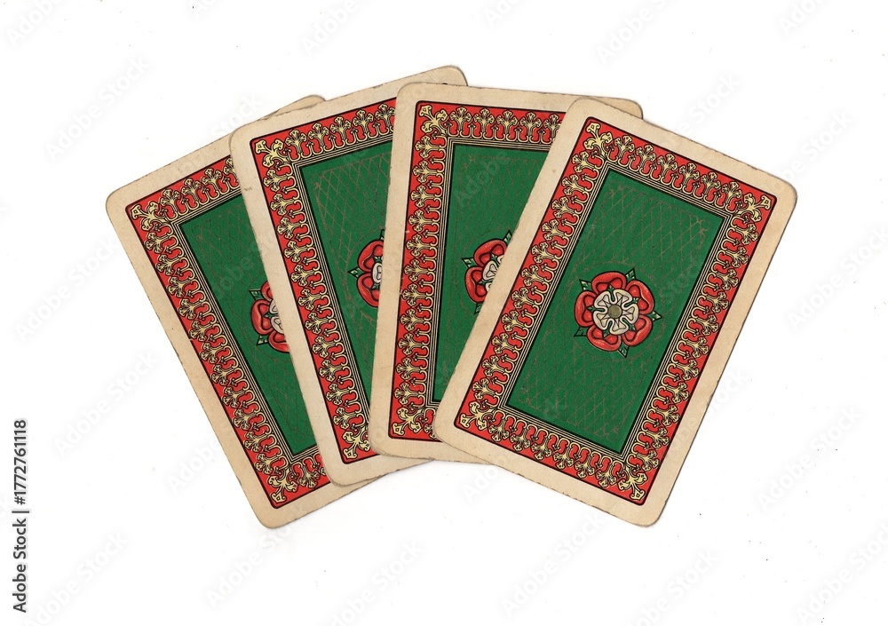 Fotografie A hand of vintage playing card backs isolated on a white background
