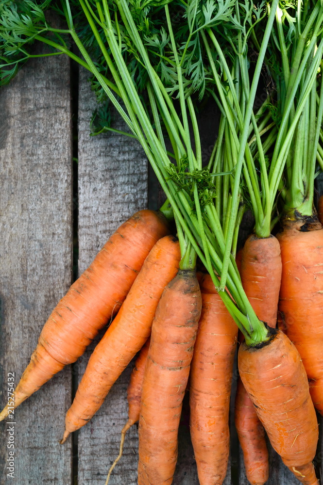 Fotografie A large bunch of fresh carrots on an old wooden table in the garden