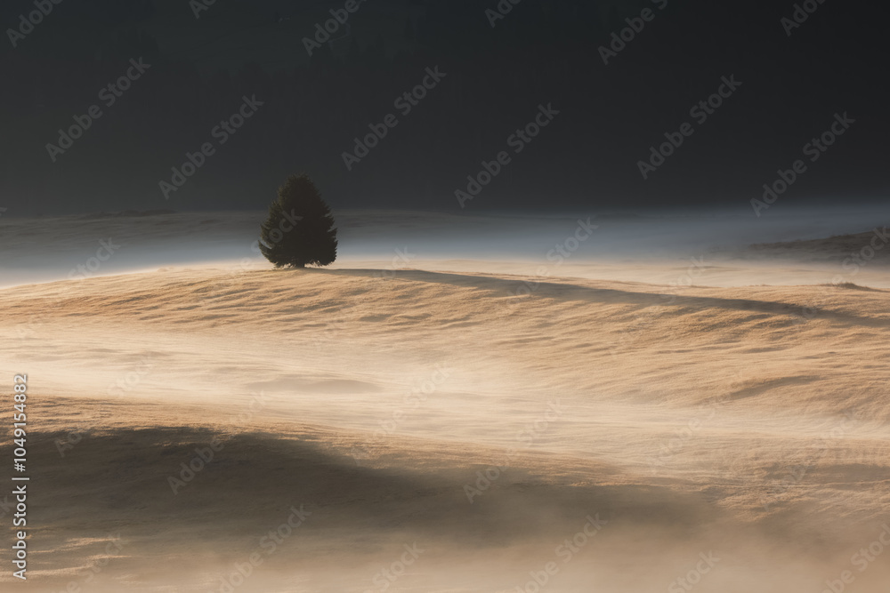 Fotografie A lone tree casts a long shadow over the misty alpine meadow of Alpe di Siusi in the Italian Dolomites, South Tyrol, illuminated by soft golden light