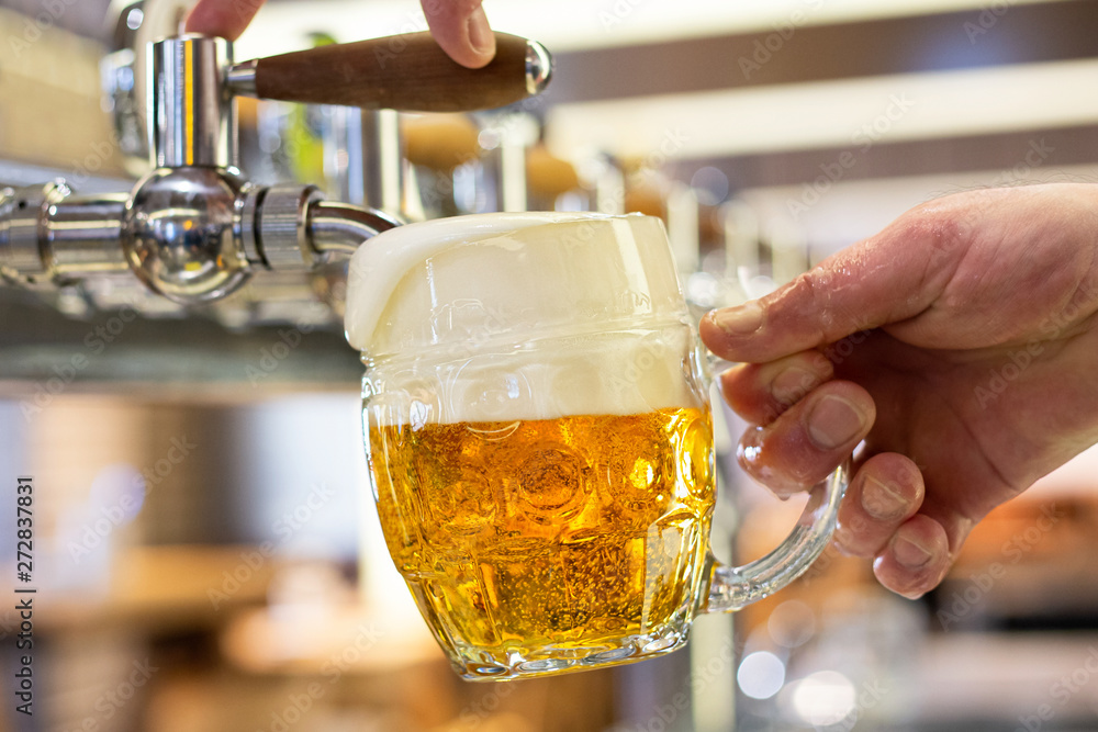 Obraz na plátně A man pouring draft lager beer into a dimpled glass mug in a modern pub