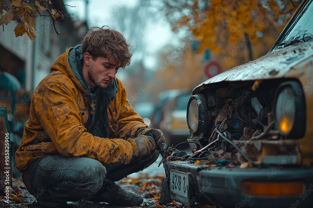 Fotografie A man trying to fix a broken car on the side of the road, clearly struggling and frustrated