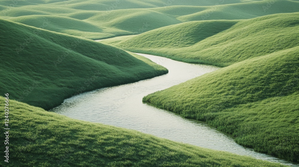 Fotografie A meandering river glides through rolling green hills, creating a tranquil scene that evokes the beauty of untouched nature