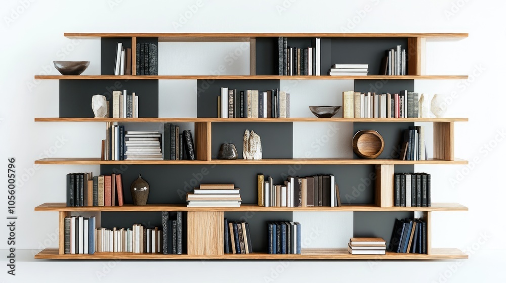 Fotografie A modern bookshelf set against a white wall, filled with books and decorative items, ideal for concepts around knowledge and design