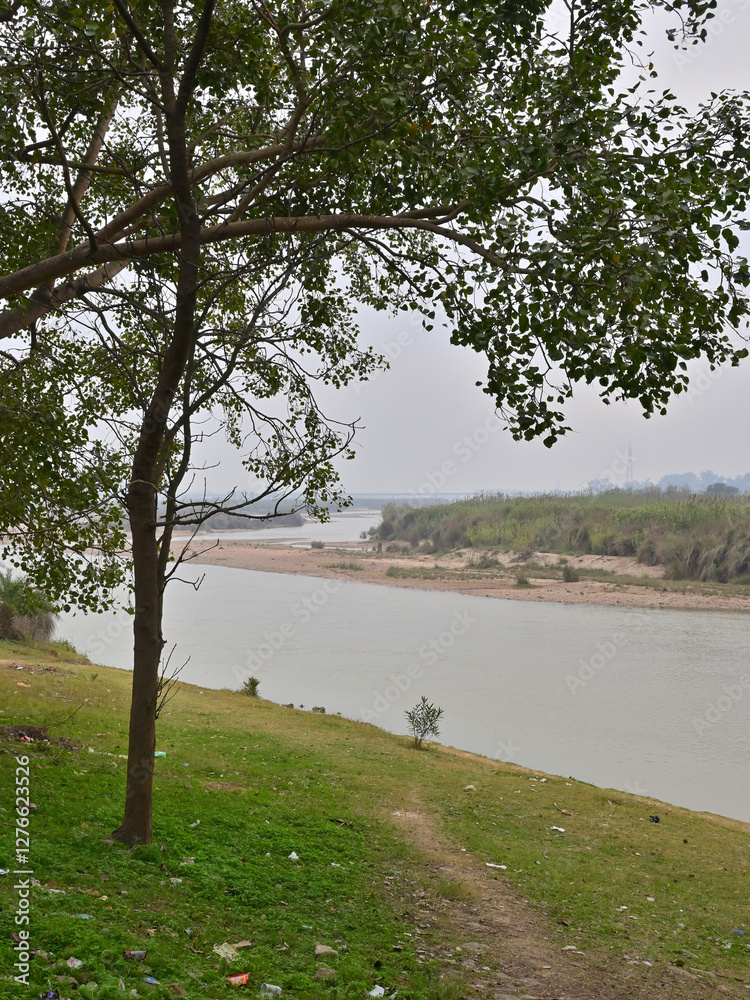 Fotografie A serene riverscape with a gently flowing river bordered by grassy banks