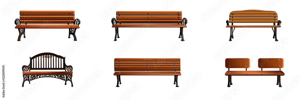Obraz na plátně A set of brown wooden park benches offers outdoor seating
