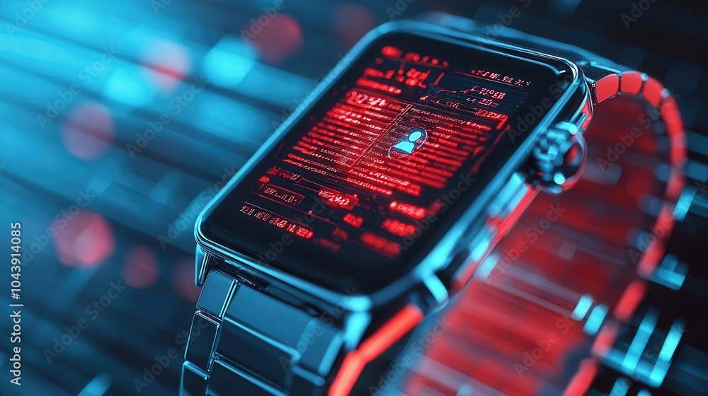 Fotografie A sleek smartwatch displays glowing red data against a futuristic blue backdrop, blending technology with modern aesthetics