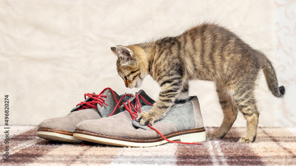 Fotografie A small kitten is playing with men's shoes