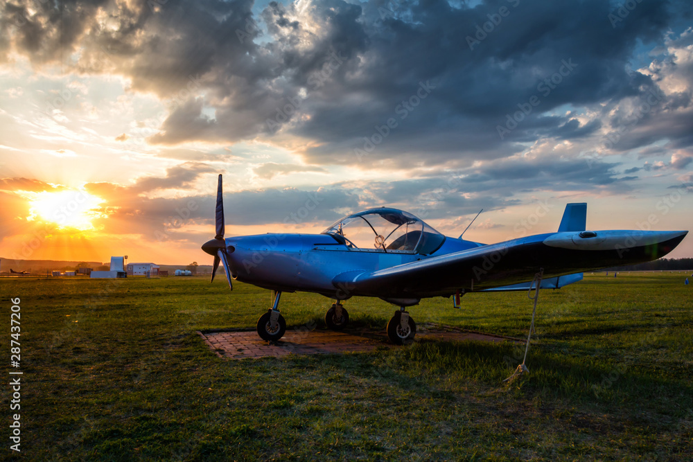 Fotografie A small sports airplane parked at the airfield at scenic sunset