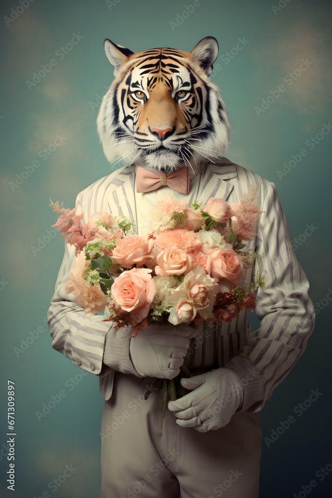 Fotografie A tiger in elegant suit holds fresh spring flowers and gives them away for Valentine's Day