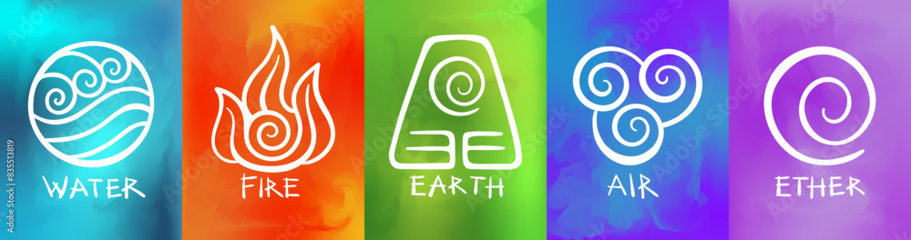 Obraz na plátně A vector banner or clip art set, with symbols of the four classical elements - water, fire, earth, and air, as well as ether or spirit, each depicted against vivid mystical colored background