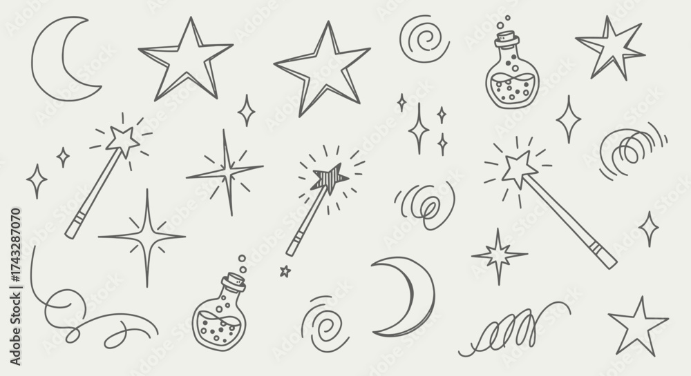 Fotografie A whimsical collection of hand-drawn magic and celestial elements like stars, moons, and wands