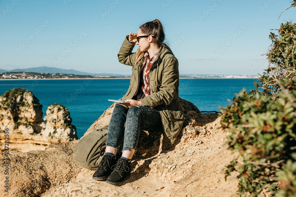 Fotografie A young beautiful girl or tourist uses a tablet and looks into the distance