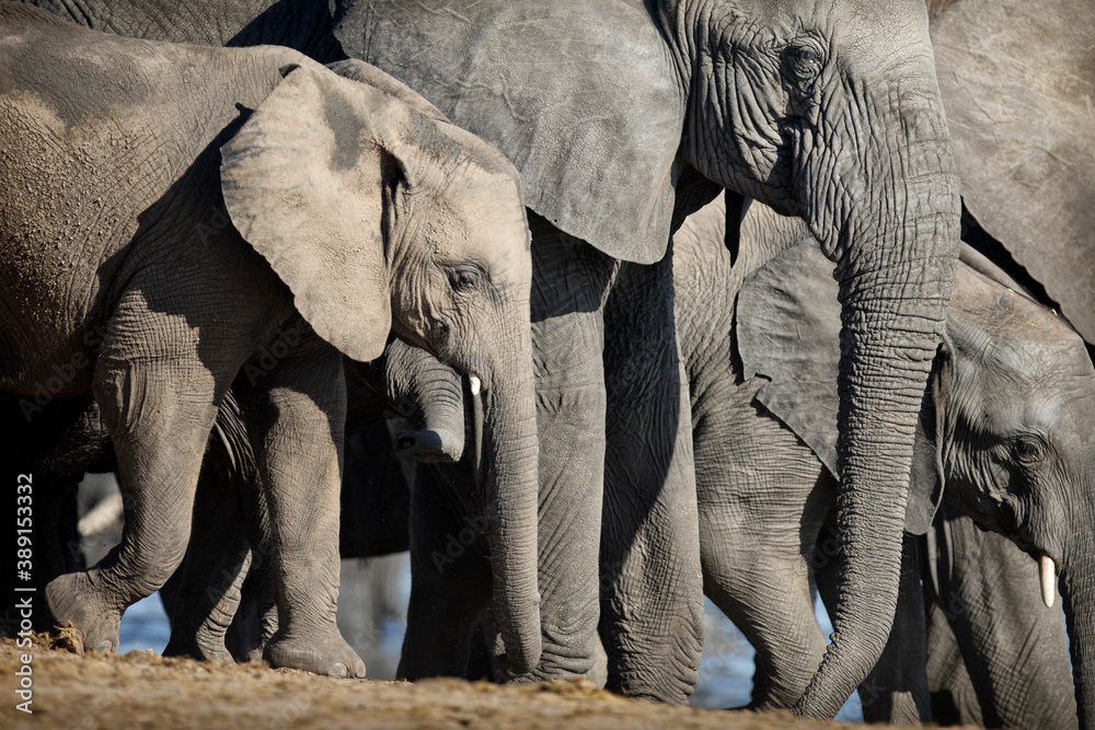 Fotografie A young elephant calf plays in the herd.