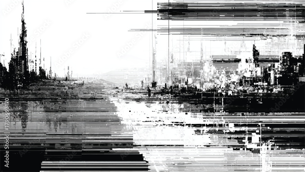 Fotografie Abstract city skyline with digital glitch effect and fragmented urban landscape isolated on white background, Vector, illustration