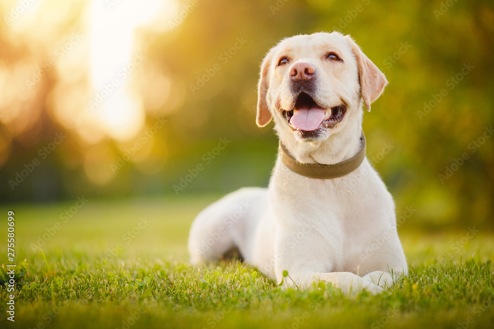 Obraz na plátně Active, smile and happy purebred labrador retriever dog outdoors in grass park o