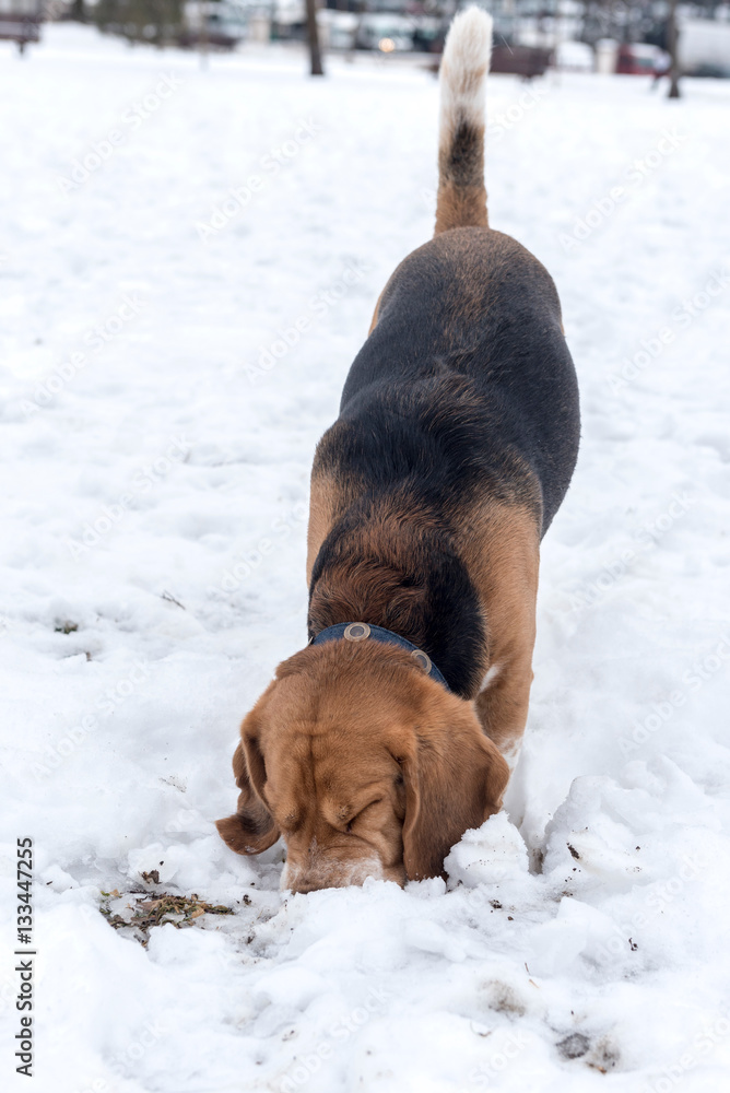 Fotografie Adult beagle in the snow