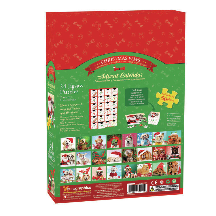 Psí parťáci v rolích svátečních pomocníků. V kalendáři je ukryto 24 mini puzzlů se svátečně naladěnými psy. Každý den se otevře jedna přihrádka a na řadu přijde samostatný obrázek o 50 dílcích. Přesné výseky zajistí, že se obrázky budou skládat téměř samy. Legrační hafaní obrázky zkrátí čekání na Štědrý den.