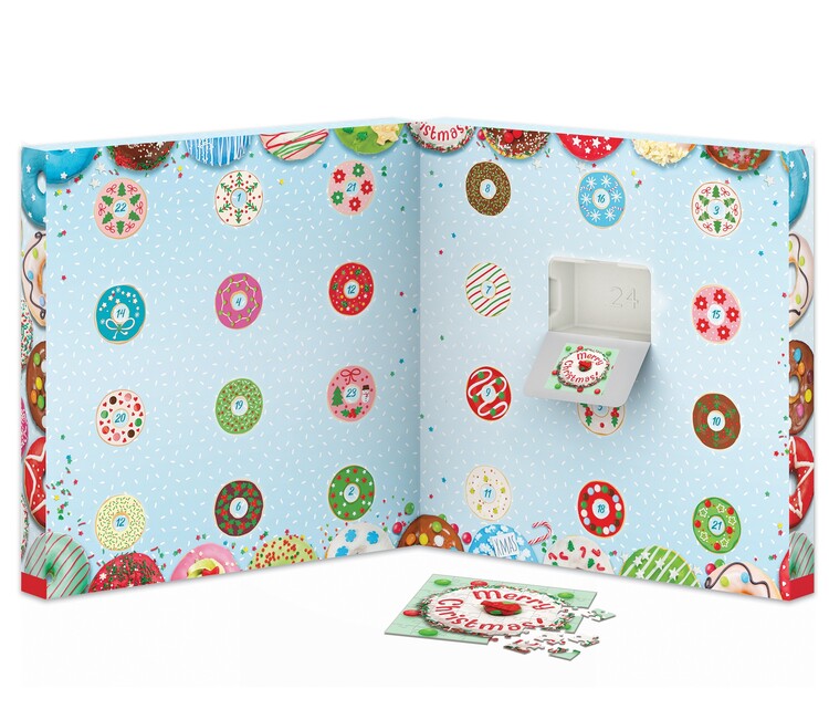Sladký advent s barevnými donuty - malé pokušení na každý den. Adventní rituál, který navodí sváteční klid a pohodu. V kalendáři se skrývá 24 „sladkých“ mini puzzlů s motivy donutů. 24 dní, 24 mini puzzlů, 50 přesně vyřezaných dílků pro každý den. Přibývající obrázky zkracují čekání na Štědrý den.