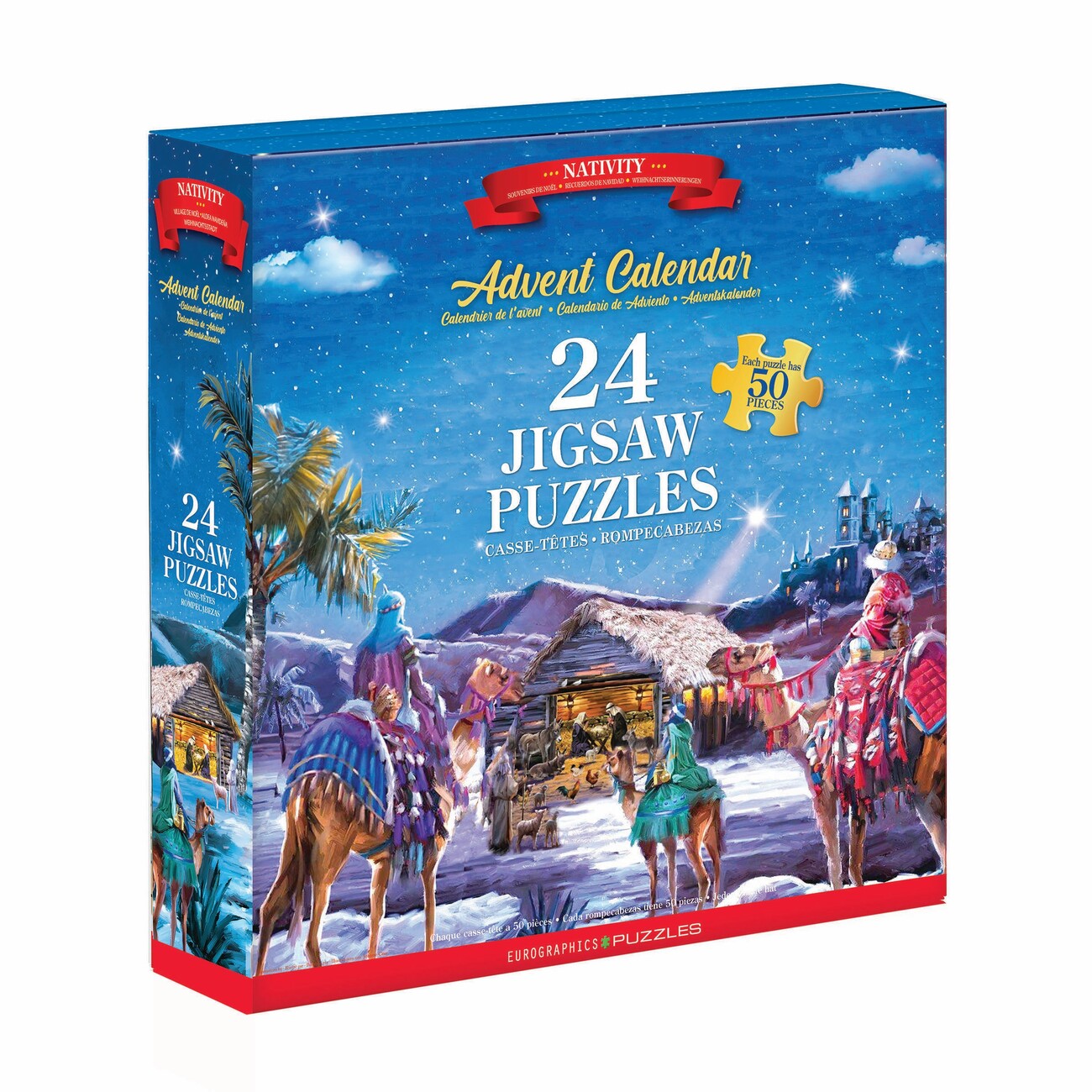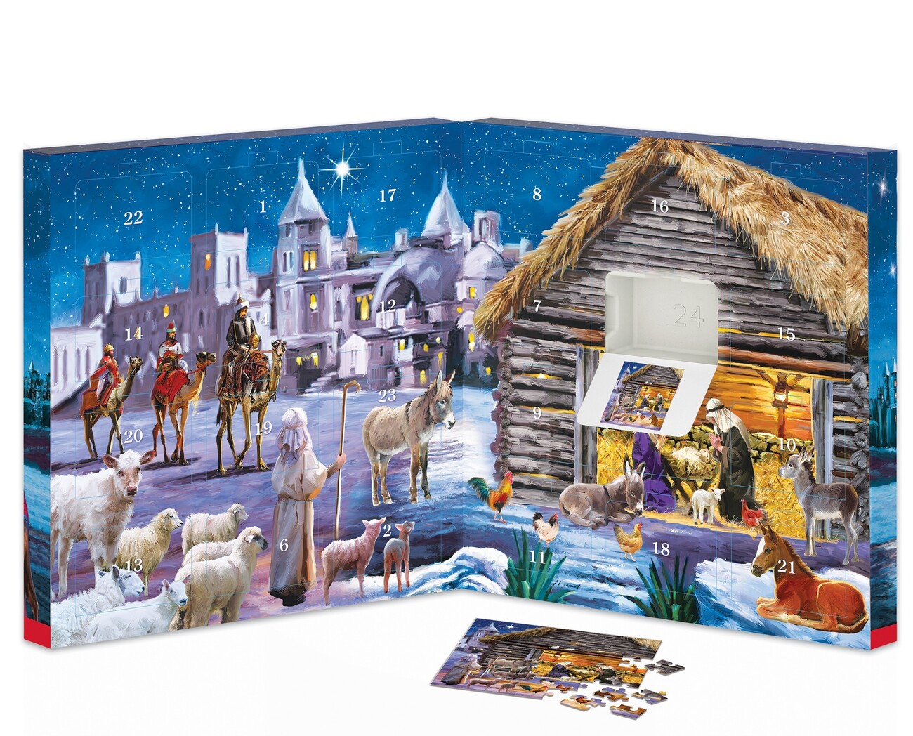 Tiché motivy betlémského příběhu pro klidné adventní večery. Adventní rituál, který navodí sváteční klid a pohodu. V kalendáři je 24 mini puzzlů s výjevy z narození Ježíše. Každý den se otevře jedna přihrádka a na řadu přijde samostatný obrázek o 50 dílcích (celkem 1200). Přesné výseky zajišťují plynulé skládání. Obrázky přibývají den po dni a zútulní čekání na Štědrý den. Ilustrátor: Macneil Studio.