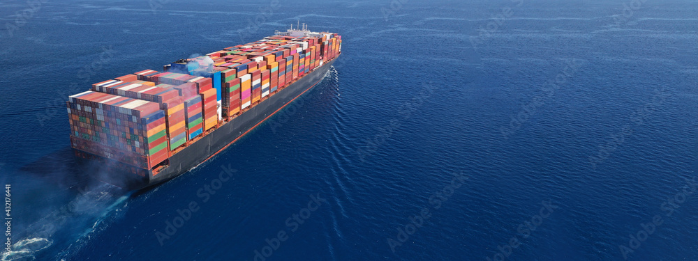 Fotografie Aerial drone ultra wide photo above huge colourful container carrier vessel crui