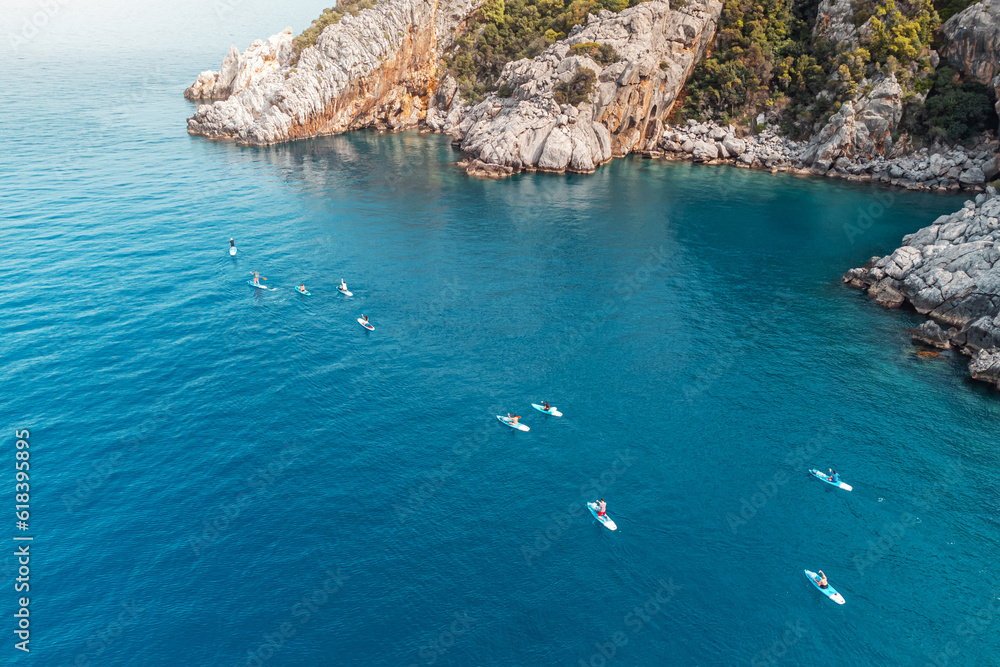Obraz na plátně Aerial view of a group or team with paddles swims on a SUP boards on the sea near scenic rocks