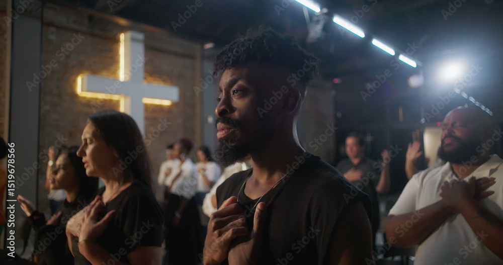 Obraz na plátně African American man in emotional worship, hand raised and over heart, glowing c