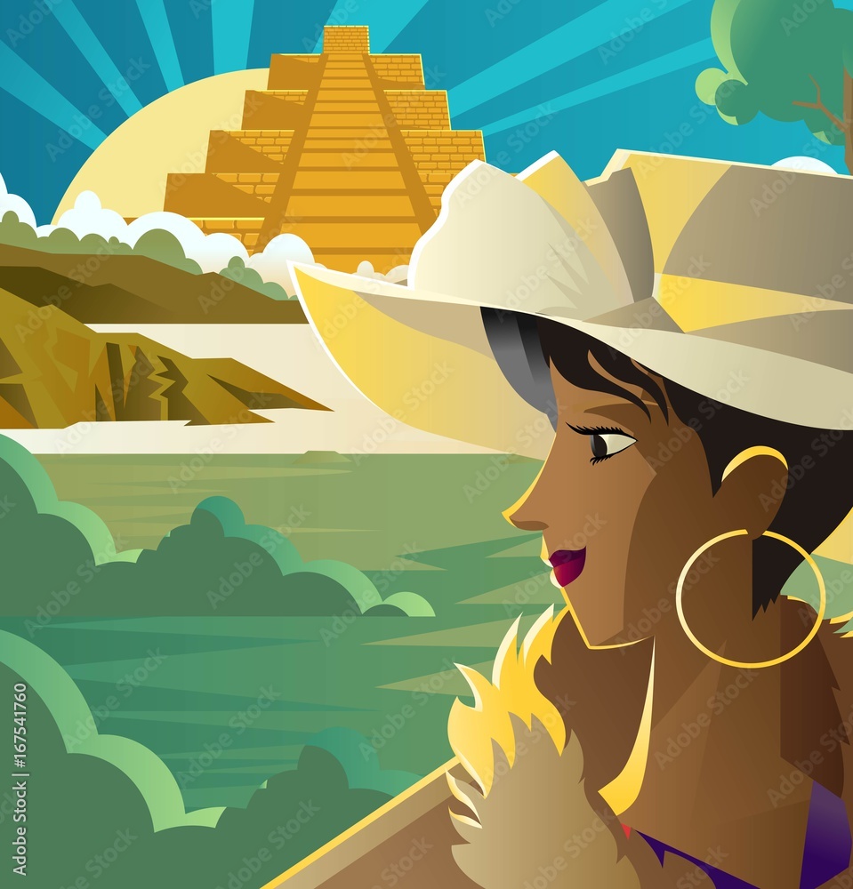 Fotografie african woman on mexican aztec temple in mexico
