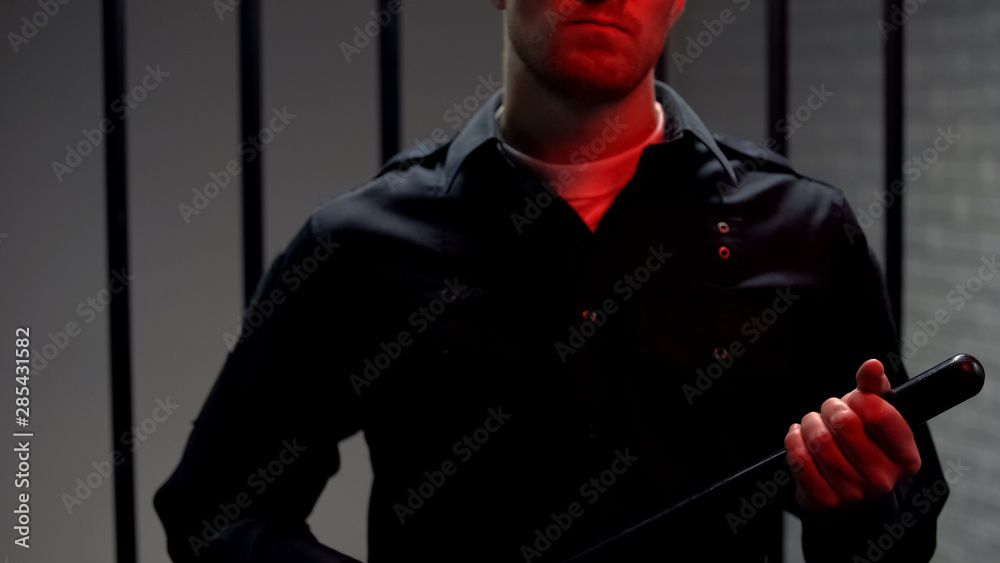 Fotografie Aggressive warden holding truncheon standing against prison cell, red lights