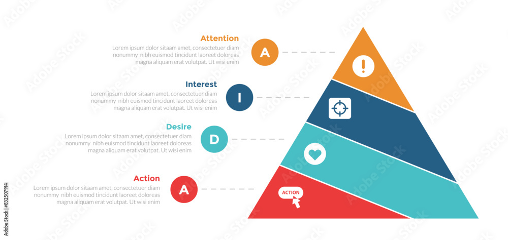 Obraz na plátně AIDA marketing funnel infographics template diagram with pyramid cut skew with 4