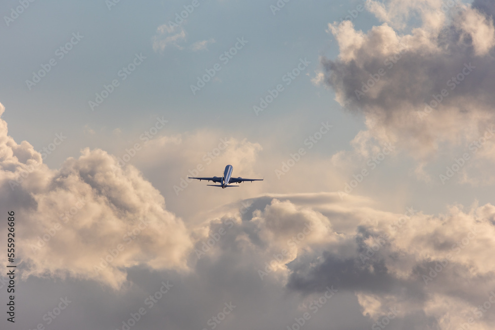 Obraz na plátně Aircraft taking off at Stuttgart Airport, against bright cloudy sky