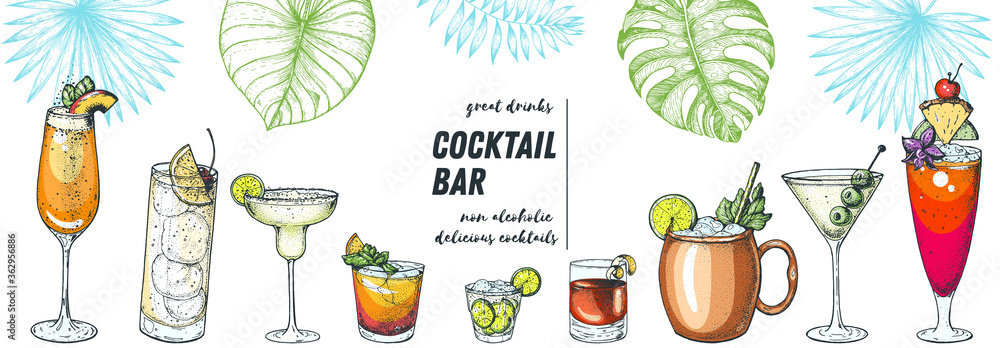 Fotografie Alcoholic cocktails hand drawn vector illustration