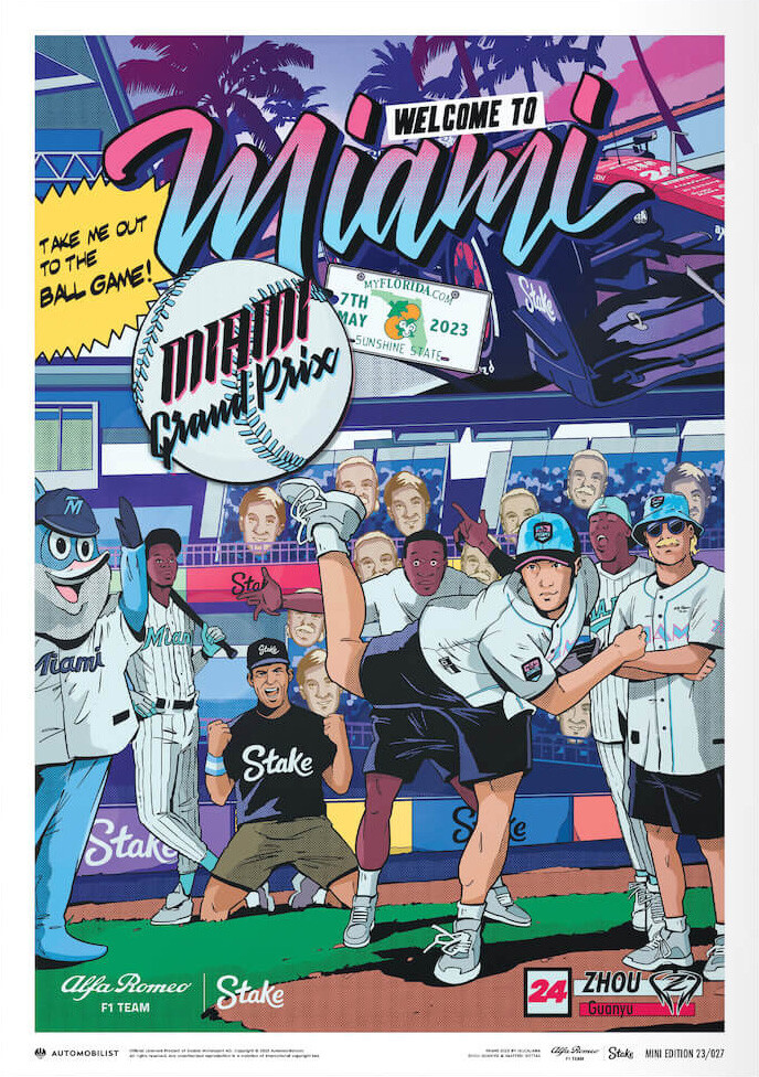Alfa Romeo F1 Team Stake pro sezonu 2023 připravil pro každou Grand Prix kreslený plakát s motivy pořadatelského města. Autorem je Jalcalara, který v typickém cartoon stylu ztvárnil Zhoua Guanyu a Valtteriho Bottase v atmosféře Floridy, tentokrát při baseballovém zápase. Nechybí ani monopost C43 a množství detailů, které fanoušky pobaví. Limitovaná edice jako suvenýr k Velké ceně Miami.